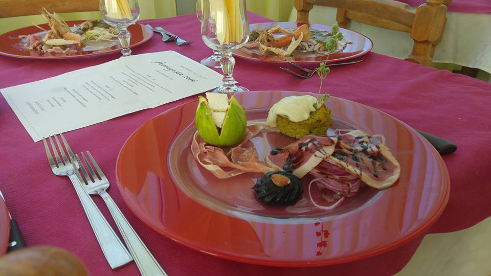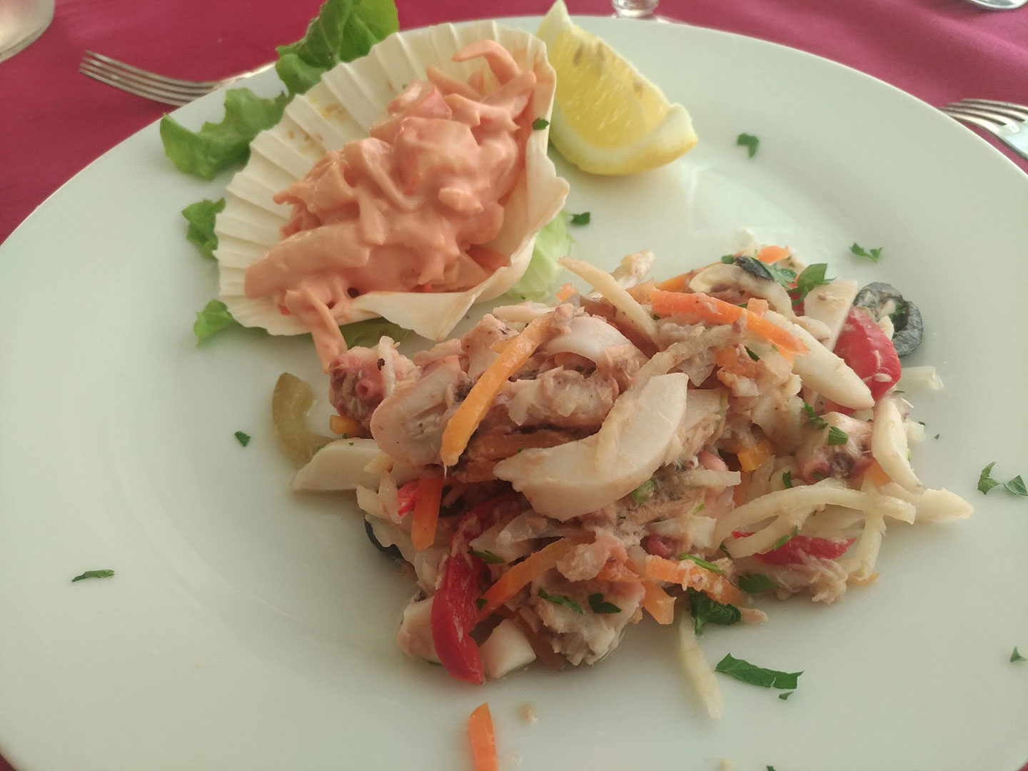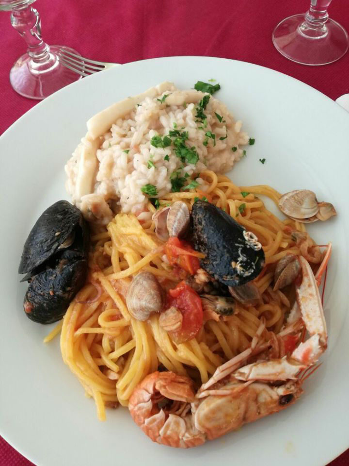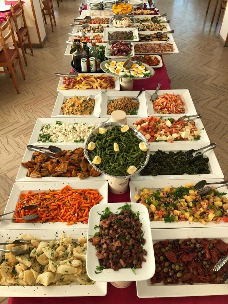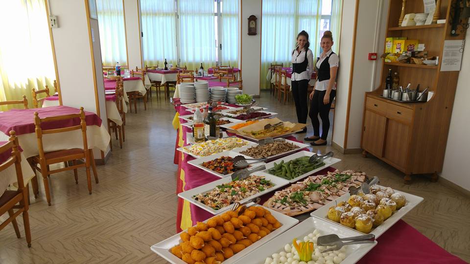 Il pranzo e la cena con ampio buffet di antipasti e contorni con fritture, verdure cotte e crude, focacce, pizze e piadine per iniziare ed un menu servito al tavolo con ad ogni pasto tripla scelta tra piatti di carne e di pesce e opzione per i bambini e vegetariani.